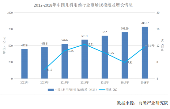 我國兒童用藥市場,不論是在規(guī)模上,還是在增速上,都較為可觀。數(shù)據(jù)顯示,2018年,我國兒科用藥市場規(guī)模達到786億元,同比增長11.72%,據(jù)預(yù)計2020年市場規(guī)模在千億元以上。