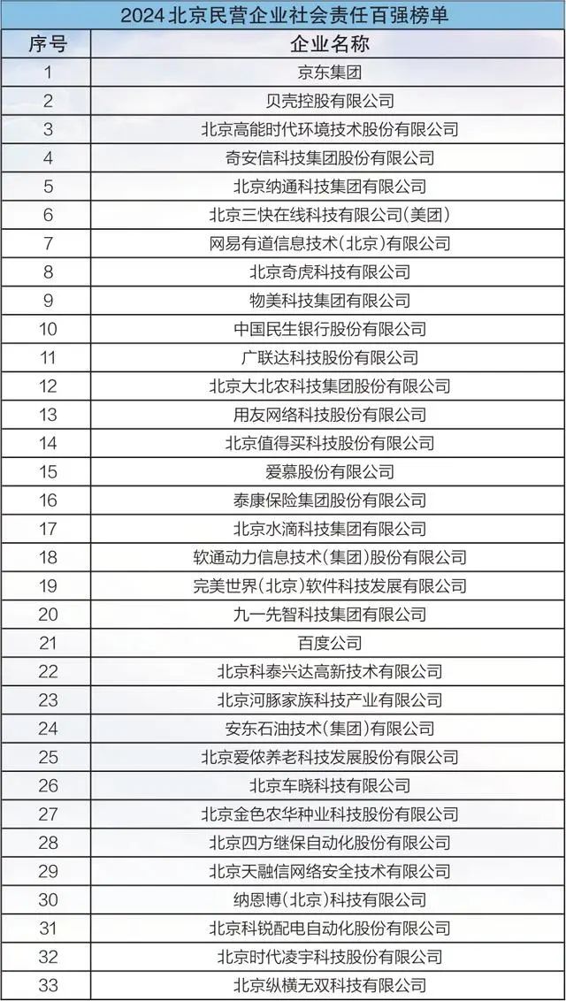 今年是北京民營企業百強發布的第七年。本次民營企業百強榜單發布以黨的二十屆三中全會精神為指引,深入貫徹市委十三屆四次、五次全會精神,對照進一步全面深化改革的新任務、新目標和新時代工商聯工作的新定位、新使命,優化調研評價指標體系,形成2024北京民營企業100強、科技創新100強、文化產業100強、中小企業100強、社會責任100強榜單。