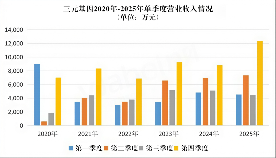 2025年第四季度,三元基因營業收入規模為1.23億元,環比增速達到176%,同比也提升了40%。拉長時間周期來看,公司去年四季度營收是自2020年公布季度數據以來的最好水平,首次實現單季營收突破億元大關。