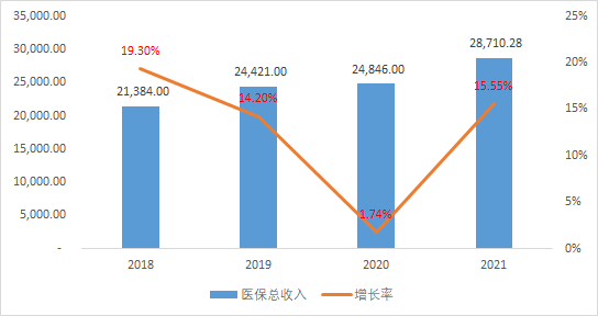 2021年,基本醫(yī)療保險基金(含生育保險)總收入、總支出分別為28710.28億元、24011.09億元,年末基本醫(yī)療保險(含生育保險)累計結(jié)存36121.54億元。