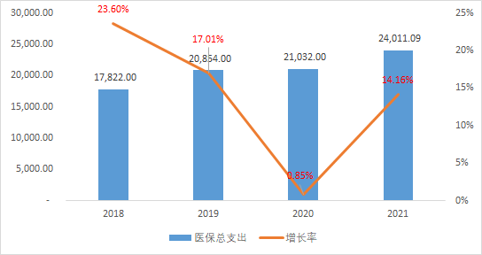 醫(yī)保基金支出近4年年復合增長率達10.45%,醫(yī)保支出的增速略大于醫(yī)保收入的增速。但值得注意的而是,從2020年開始,醫(yī)保支出的增速開始小于醫(yī)保收入的增速,說明國家醫(yī)保控費取得較好的效果。