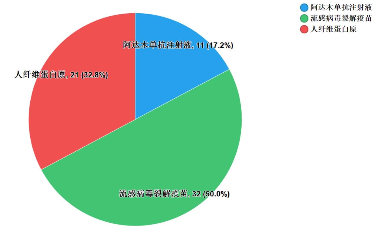 2021年國家藥品抽檢共抽檢生物制品3個品種64批次,其中生產(chǎn)、經(jīng)營、使用環(huán)節(jié)分別抽取43批次、20批次、1批次。涉及治療類品種2個,預(yù)防類品種1個,劑型均為注射劑(見圖10)。經(jīng)檢驗,所檢項目均符合規(guī)定,合格率為100%。