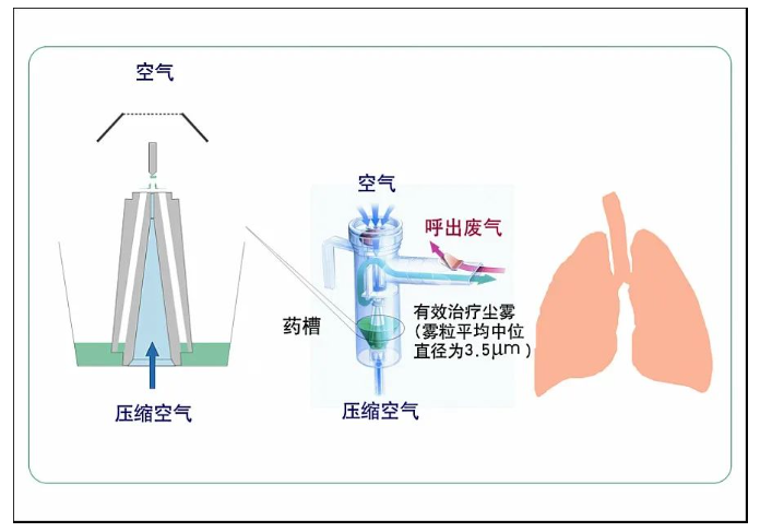 用專用霧化裝置將吸入藥物分散成液體或固體微粒即氣溶膠的形式,使其懸浮于氣體中,吸氣時隨氣流進入呼吸道及肺內,使藥物直接作用于氣道黏膜,達到潔凈、濕化氣道、局部和全身治療的目的。