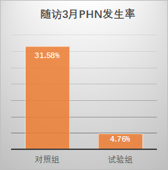 2021年發表的人干擾素α1b聯合伐昔洛韋治療急性帶狀皰疹患者的最新研究中顯示,納入60例急性期帶狀皰疹患者按1:1分組,基礎治療兩組相同,均給予適量維生素 B1和維生素 B12,鹽酸伐昔洛韋口服 0.3 g/ 次,每天2次,除此之外試驗組聯合干擾素α1b(運德素) , 10 μg/ 次,每天1次肌肉注射,療程均為10天。與對照組相比,干擾素α1b治療后VAS 評分顯著降低,隨訪3個月時PHN的發生率僅為4.76%。(見下圖)